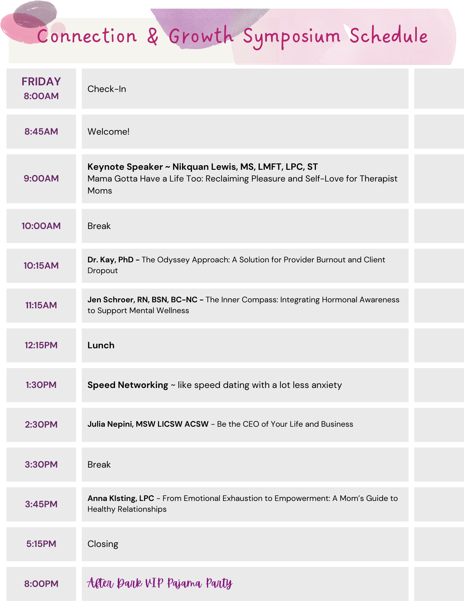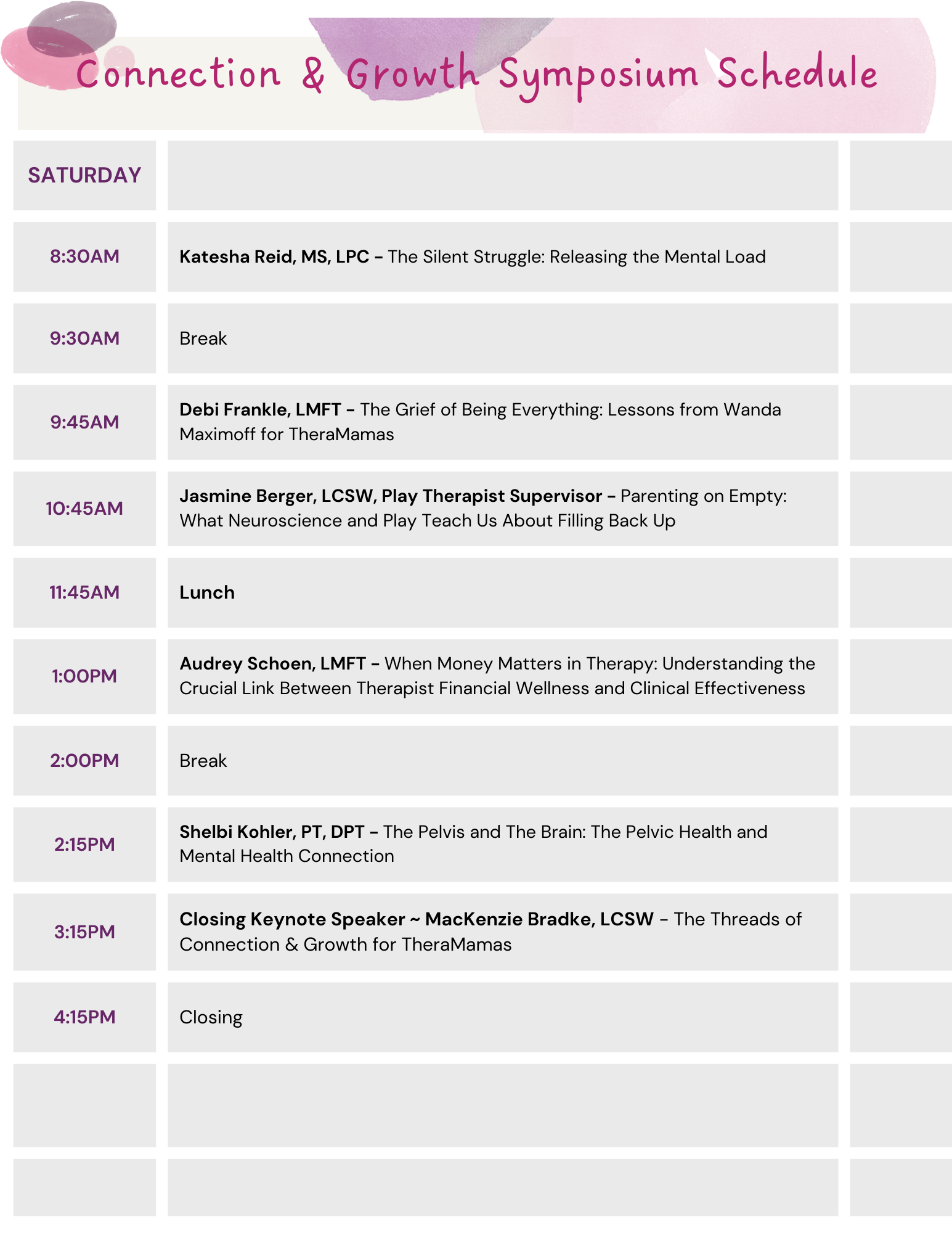 Where Therapist Moms come together to foster deep connections, share invaluable insights, and grow both personally and professionally. This incredible weekend will empower you to strengthen your community and nurture your own well-being, all while adding a spark back into your practice.